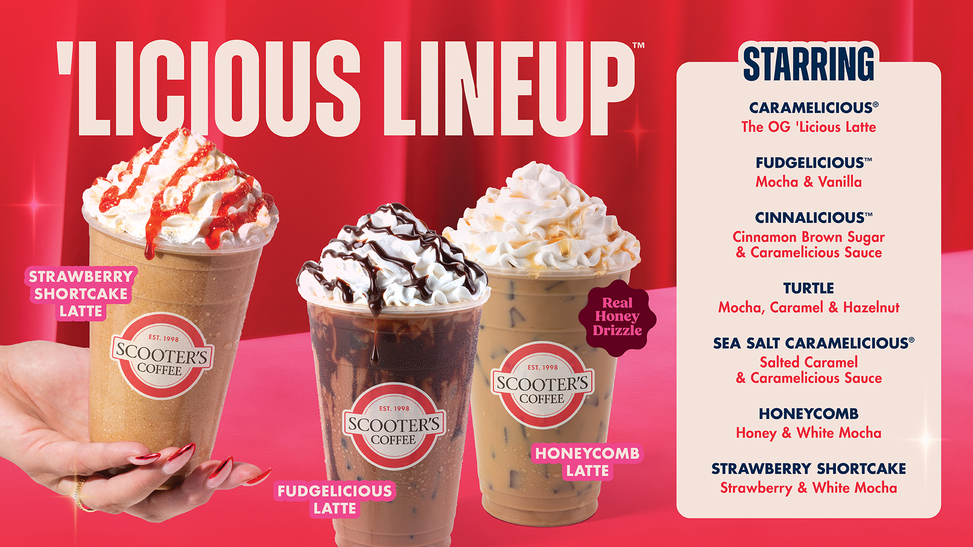 Introducing the ‘Licious Lineup at Scooter’s Coffee! These delicious signature drinks deliver fan-favorite flavors like caramel, cinnamon brown sugar, mocha, vanilla, salted caramel, honey, strawberry, and white mocha! With the introduction of this permanent new lineup, three brand new drinks will make their debut, two limited-time drinks are staying for an encore, and two longstanding crowd favorites are joining the ‘Licious Lineup club. Try these delicious drinks before they launch like a true VIP when you order through the Scooter’s Coffee mobile app with early access starting Monday, February 16!