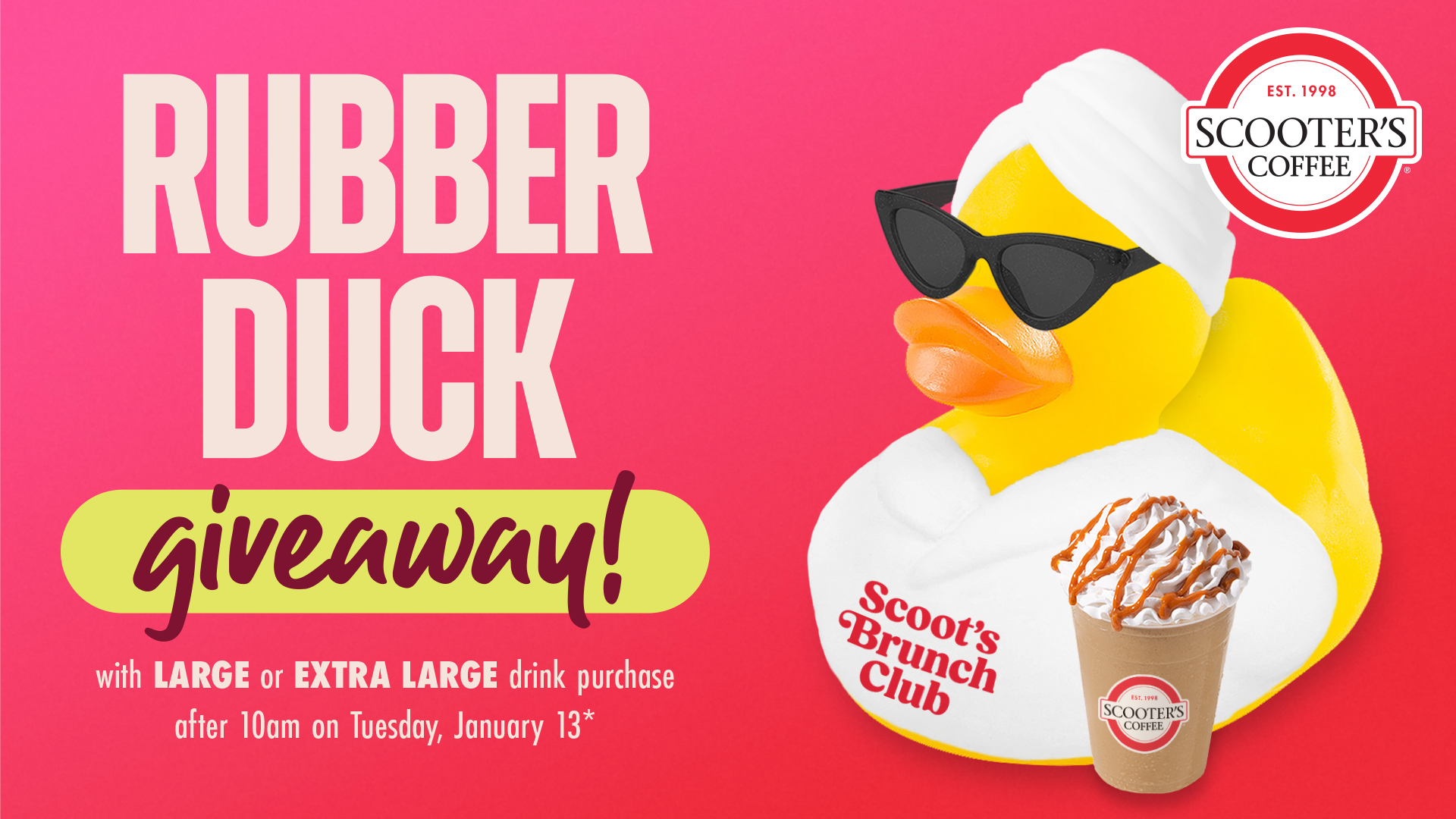 On Tuesday, Jan. 13, 2026, customers can Scoot On Around® to any Scooter’s Coffee location after 10 a.m. to receive a limited-edition Scoot’s Brunch Club Duck with the purchase of any large or extra-large drink. The ducks are donned in white bath robes with their heads wrapped in matching towels, but they didn’t forget to slip on their black sunnies for their flight to Scooter’s Coffee to grab a Caramelicious®. At each location, there is one lucky duck who stands out in the flock, sporting red sunglasses and a unique promo code for your favorite Scooter’s Coffee treat – making you a lucky duck, too!