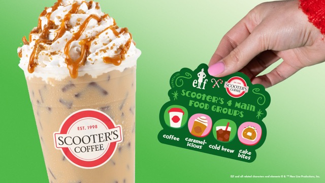 On Thursday, Nov. 20, 2025, customers can Scoot On Around® to any Scooter’s Coffee location after 11 a.m. to receive a limited-edition sticker inspired by the four main food groups mentioned in New Line Cinema’s film Elf. This co-branded Elf x Scooter’s Coffee sticker features a whimsical design and the Scooter’s Coffee four main food groups.