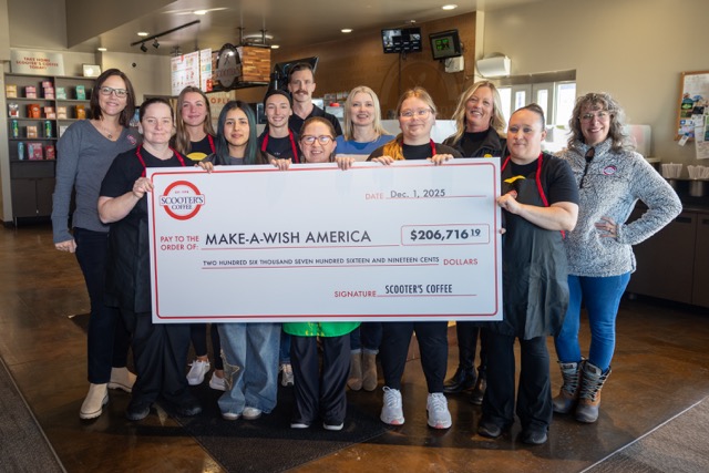 OMAHA, Neb., Dec. 2, 2025 – Through the sales of a sweet treat and the generosity of its customers, Scooter’s Coffee donated more than $200,000 to Make-A-Wish to support their mission of creating life-changing wishes for children with critical illnesses.