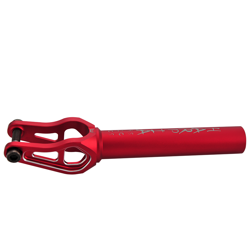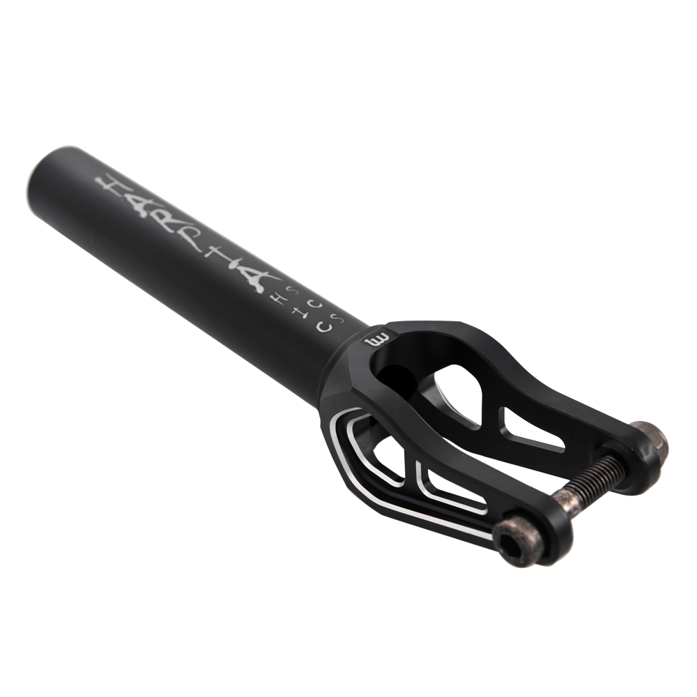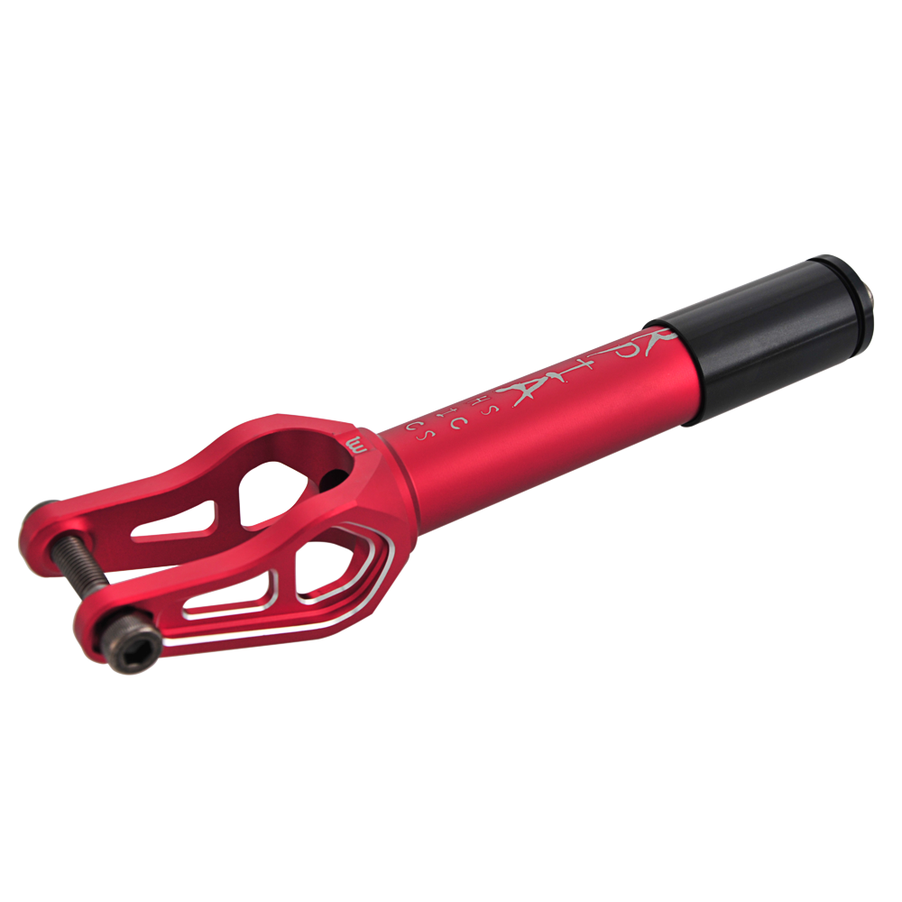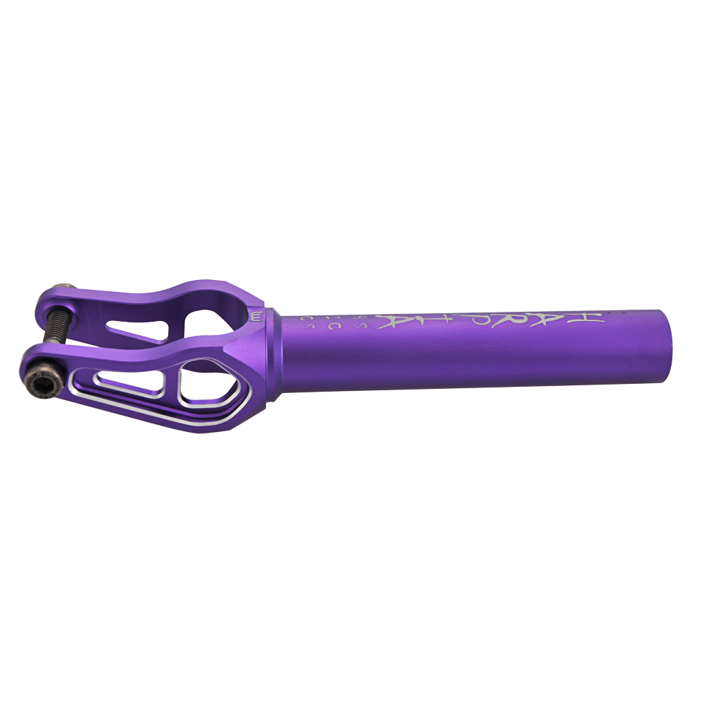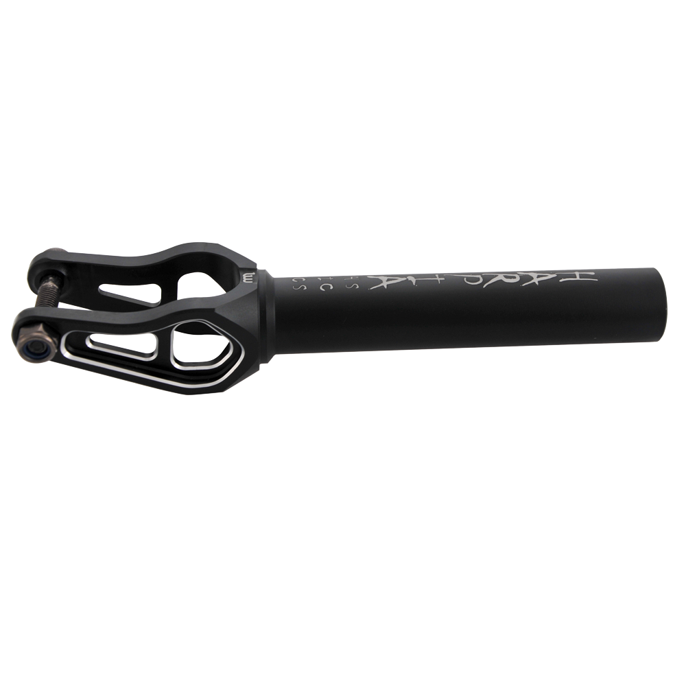 This new fork design comes with chamfered edges of the CNC cut outs. It ist strong, light and Its threadless design for HIC / IHC compression can fit 110 mm,120 mm and 125 mm wheels.