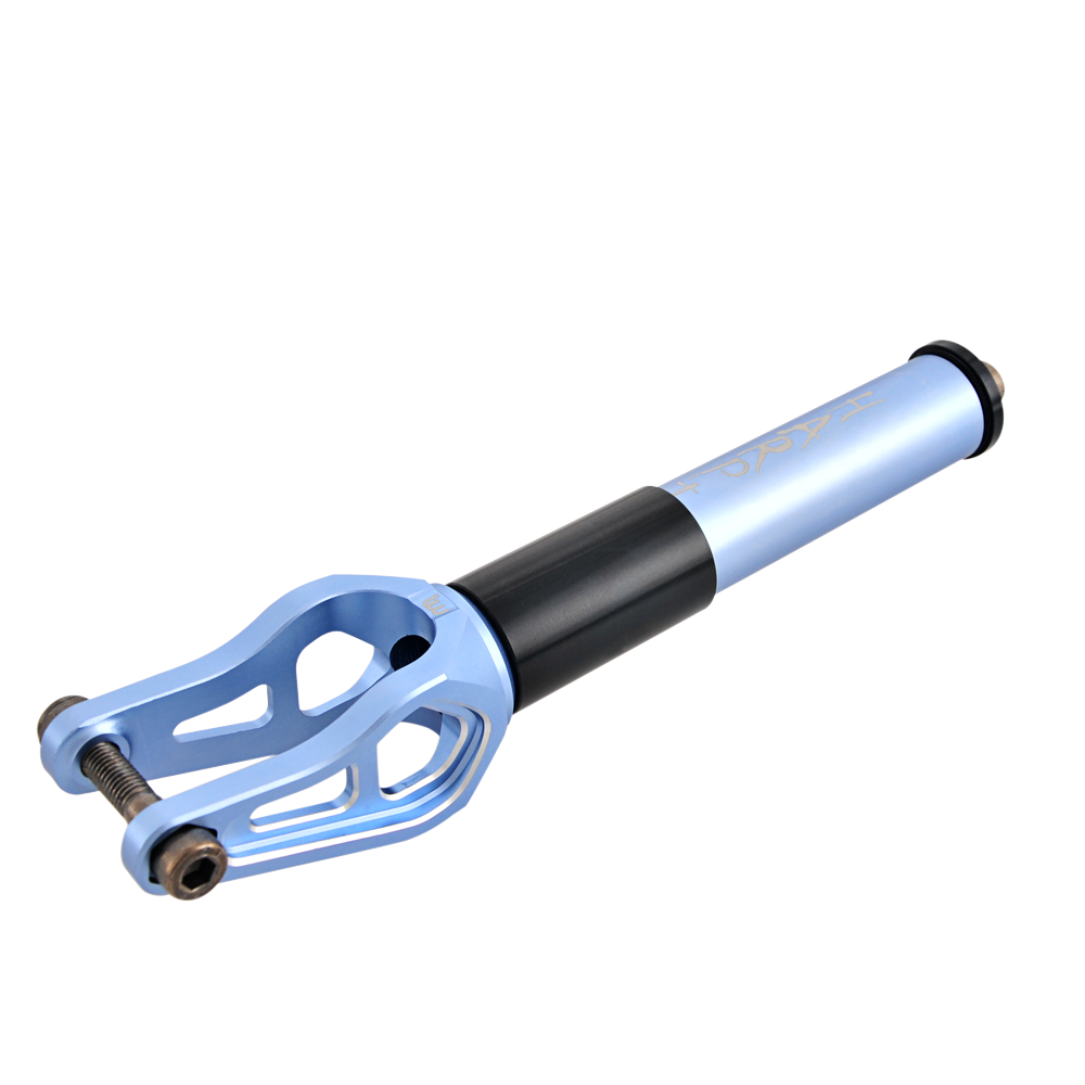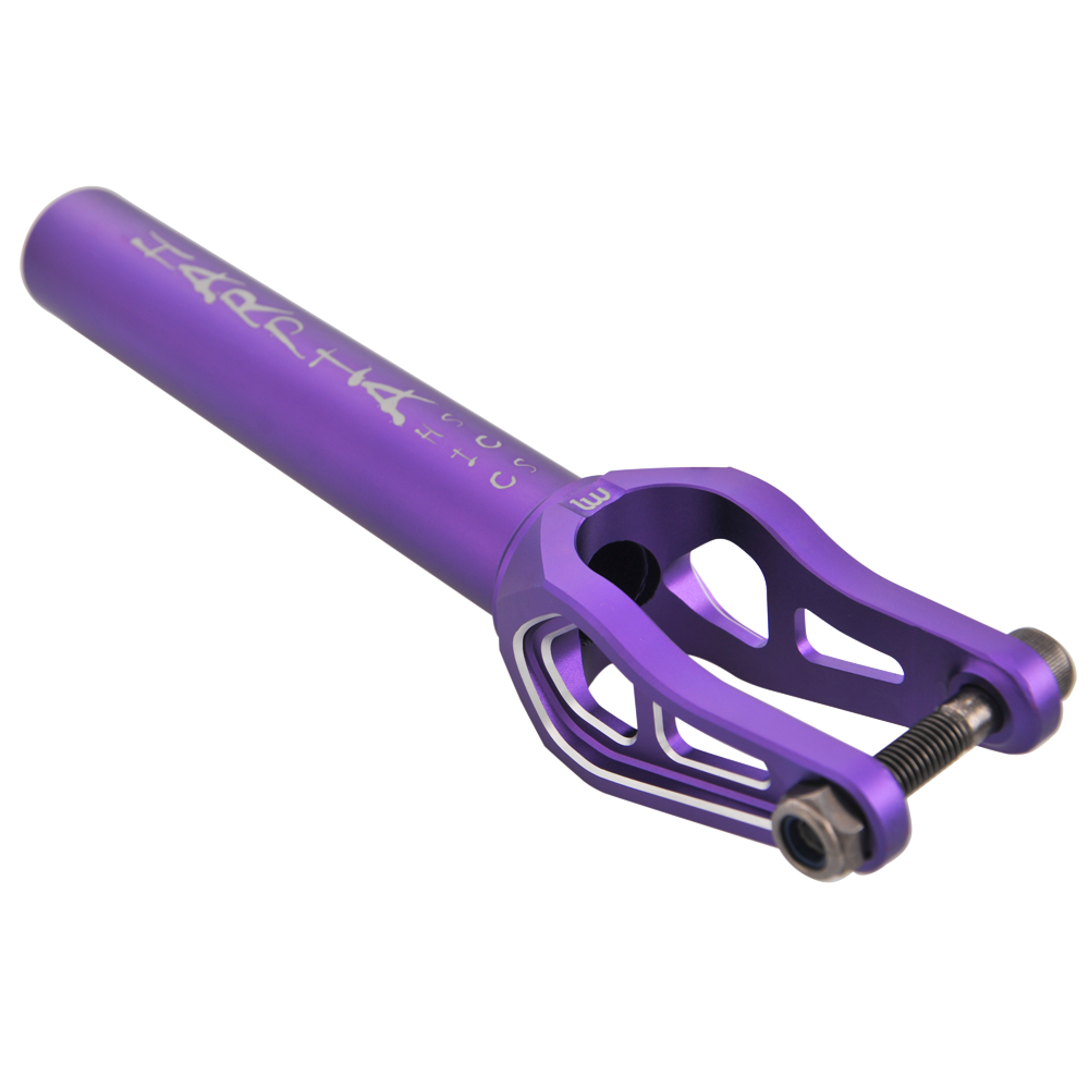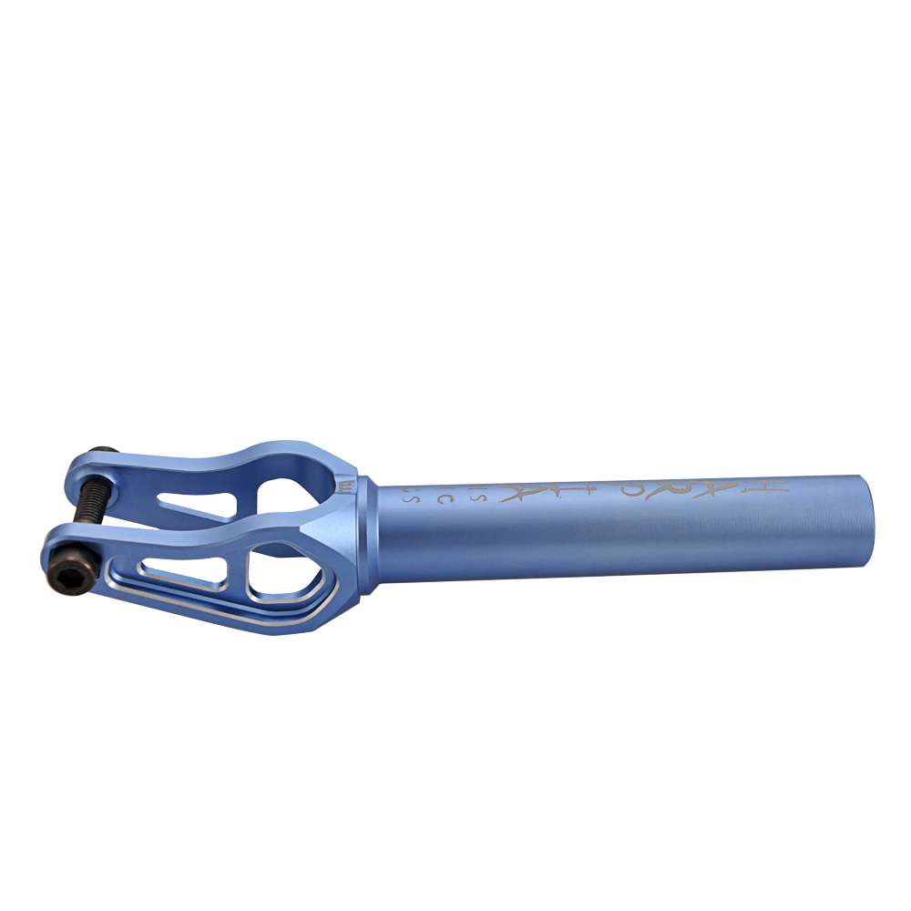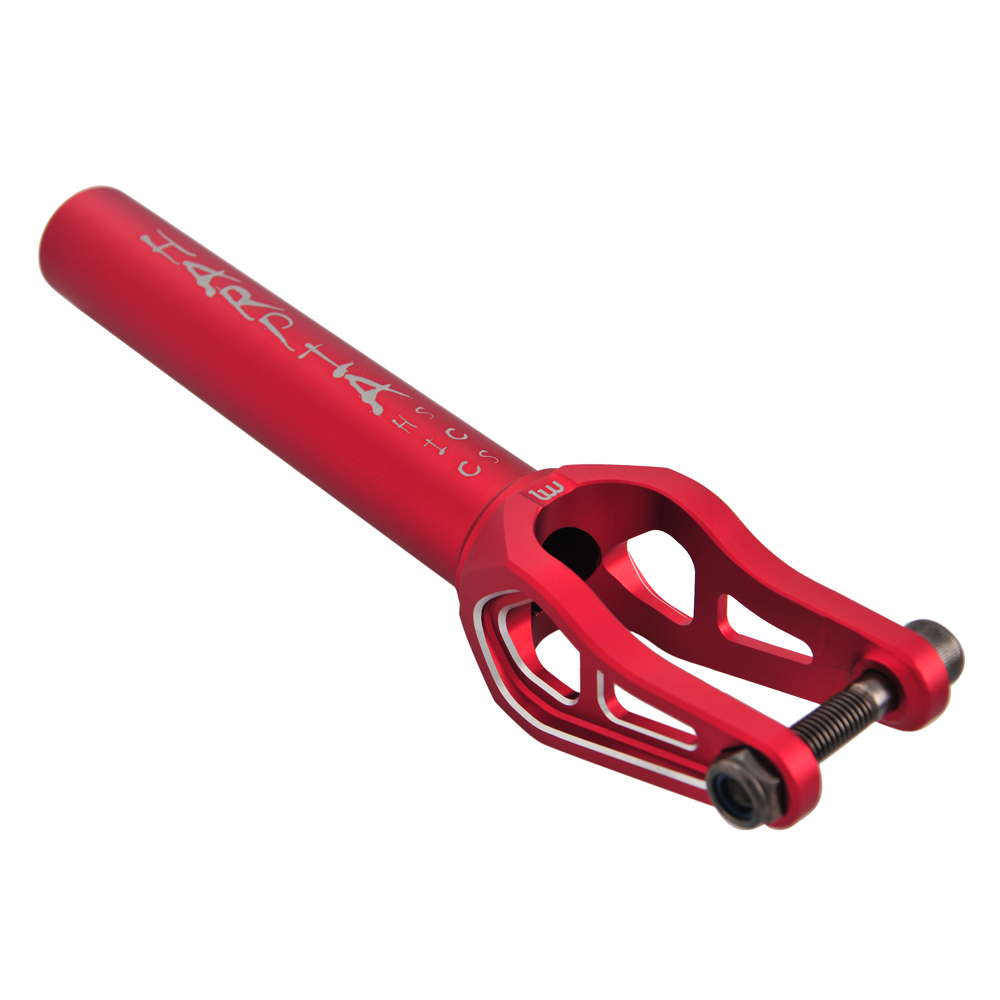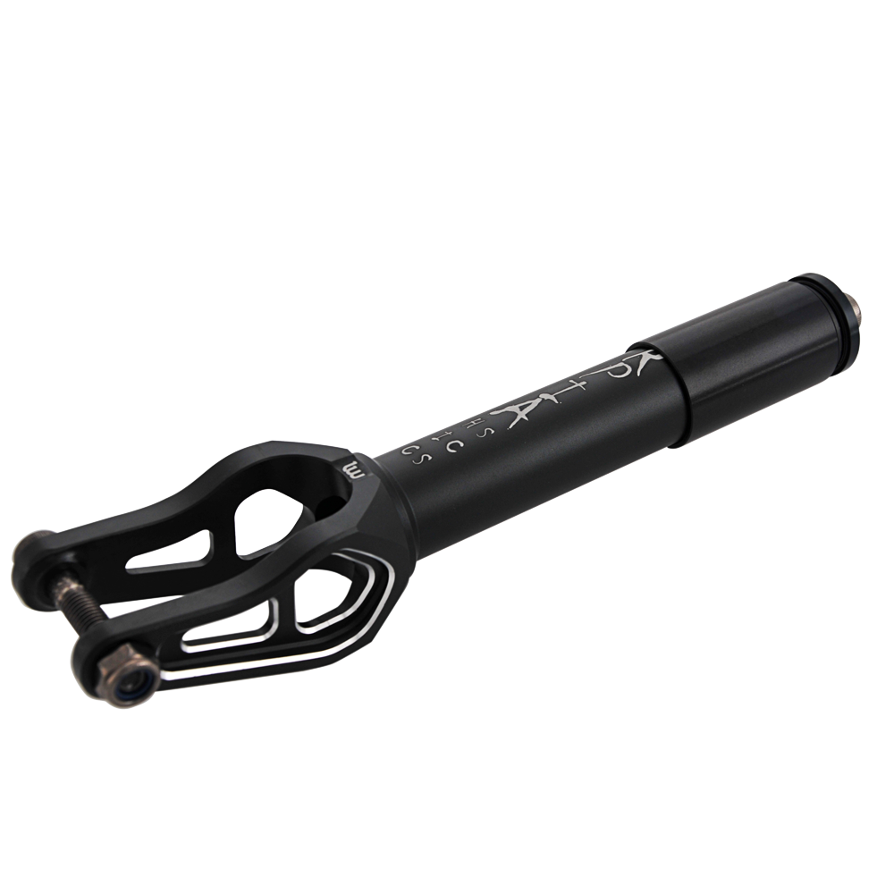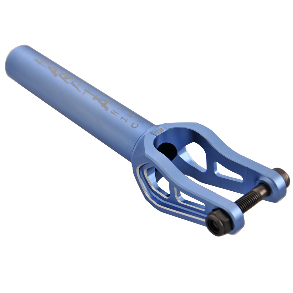 This new fork design comes with chamfered edges of the CNC cut outs. It ist strong, light and Its threadless design for HIC / IHC compression can fit 110 mm,120 mm and 125 mm wheels.