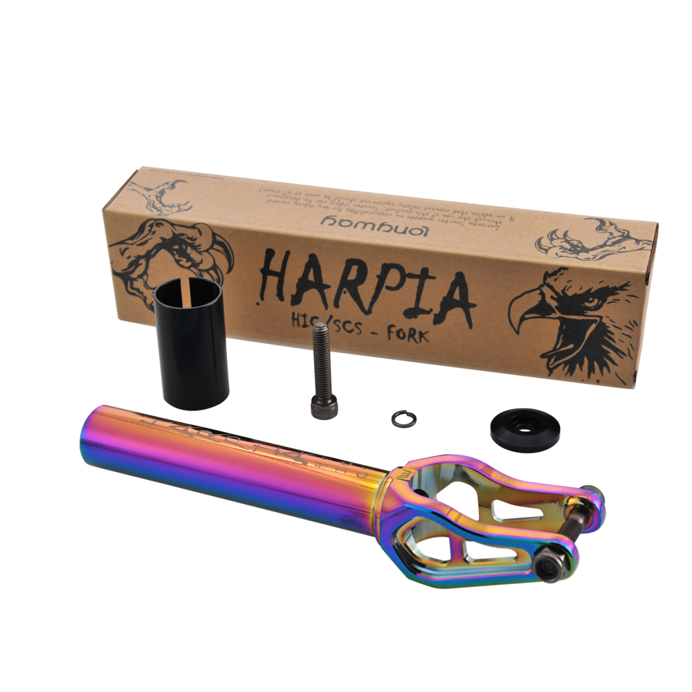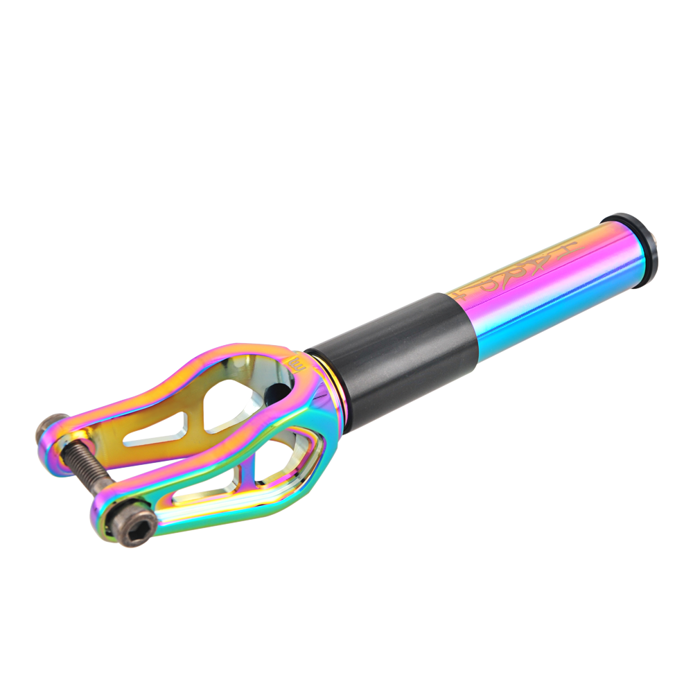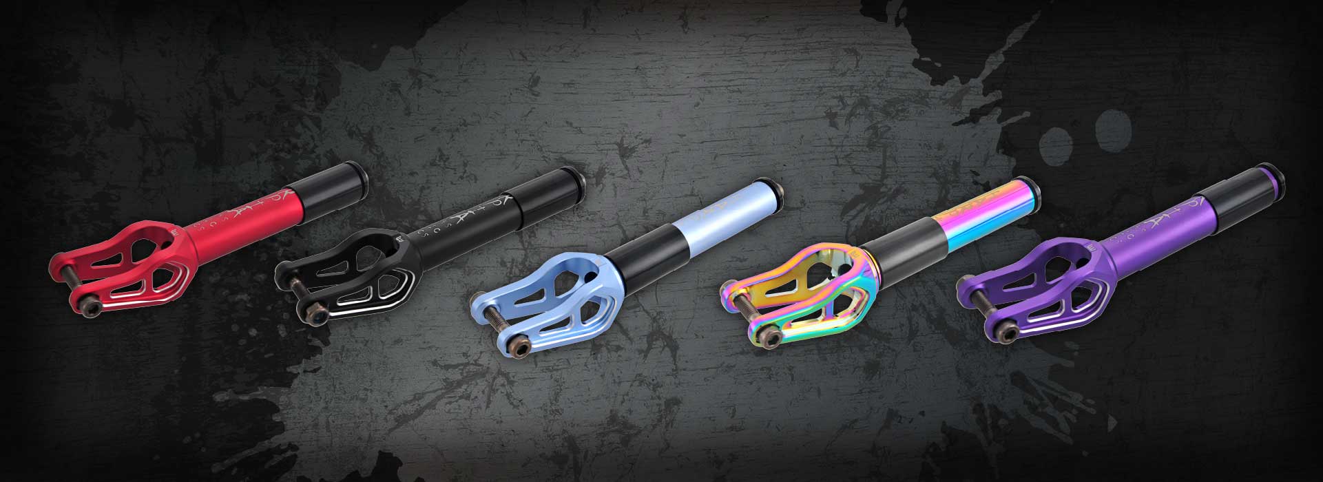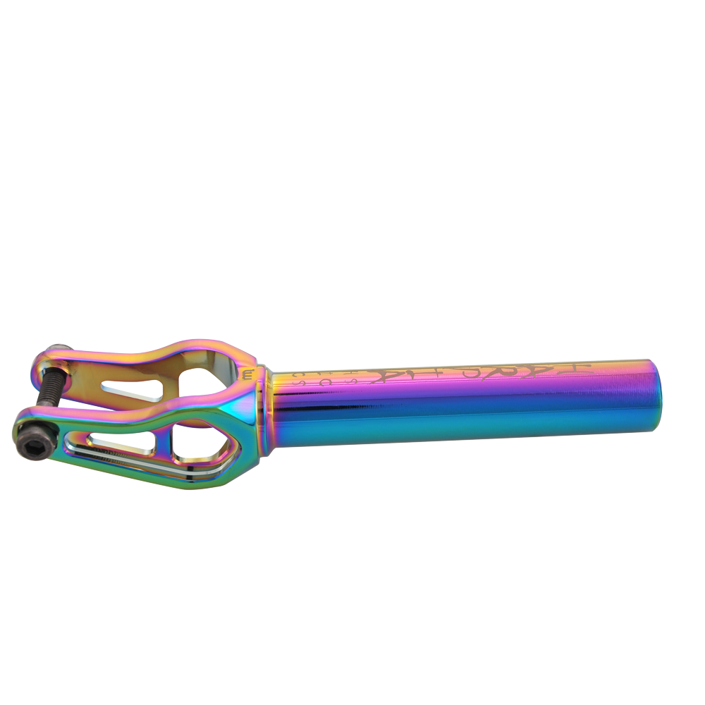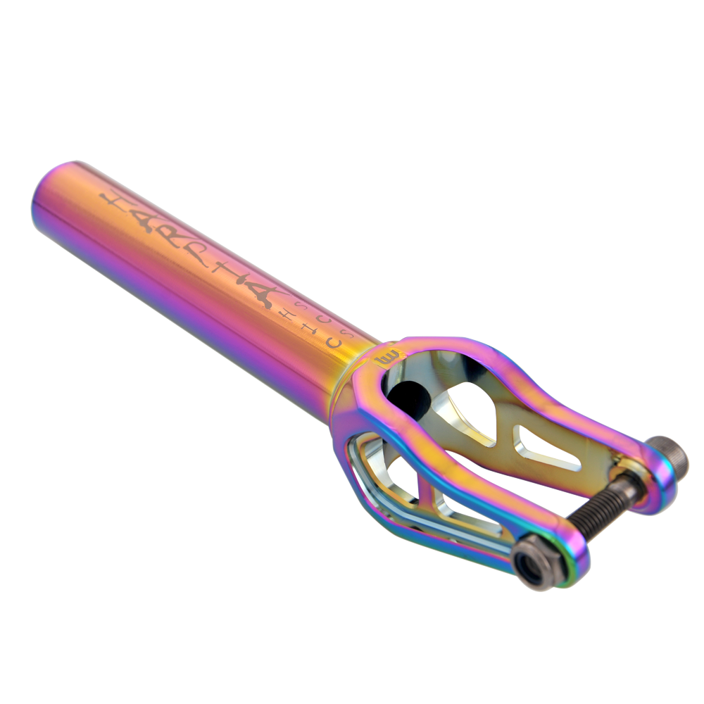 This new fork design comes with chamfered edges of the CNC cut outs. It ist strong, light and Its threadless design for HIC / IHC compression can fit 110 mm,120 mm and 125 mm wheels.