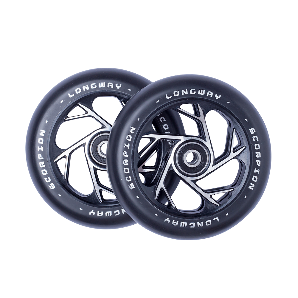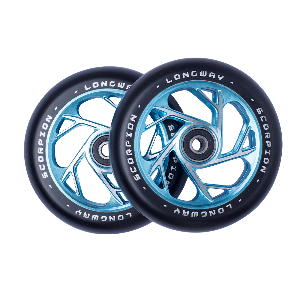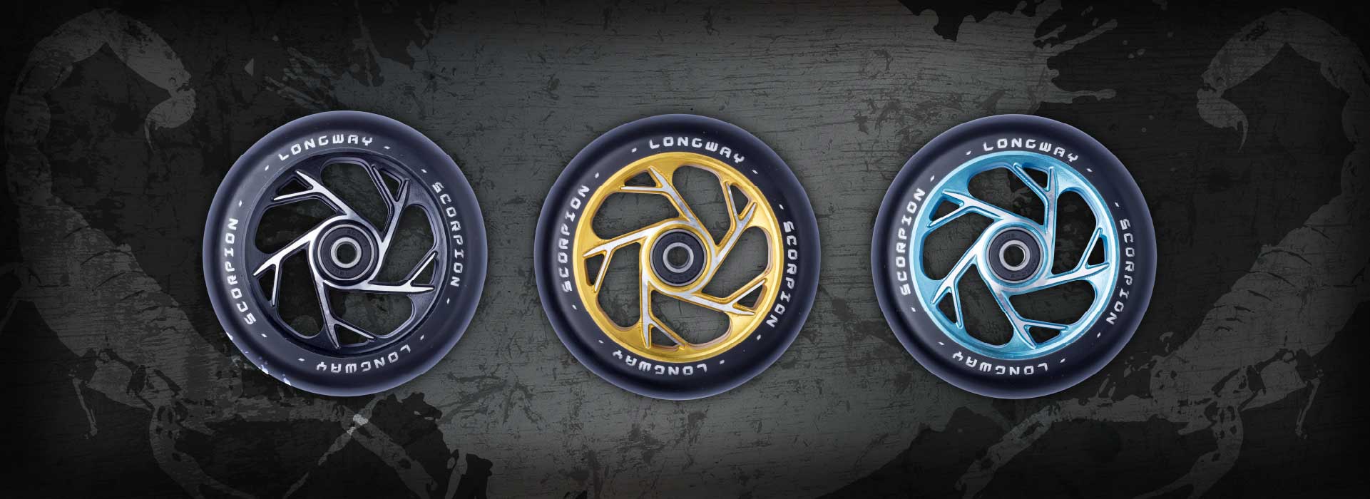 The SCORPION dual core is a unique technical achievement. Inspired by high-end sports car wheels we brought this highly complex core structure to the scootering scene! 20 supports of 10 parallel twin spokes provide a light weight and high strength.