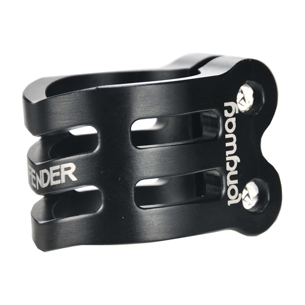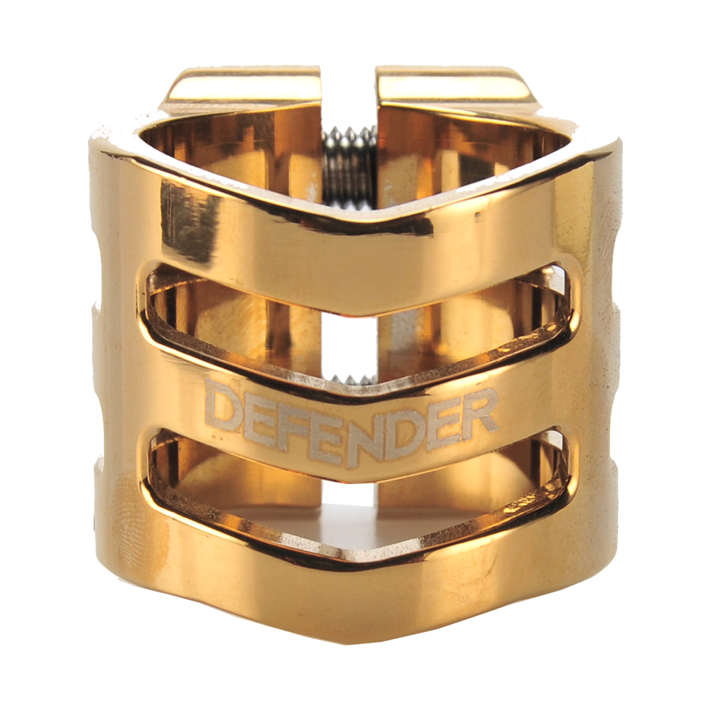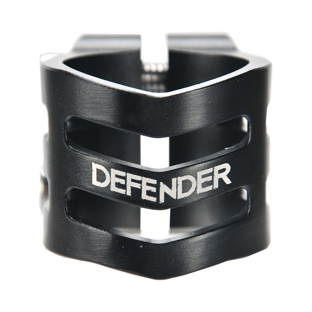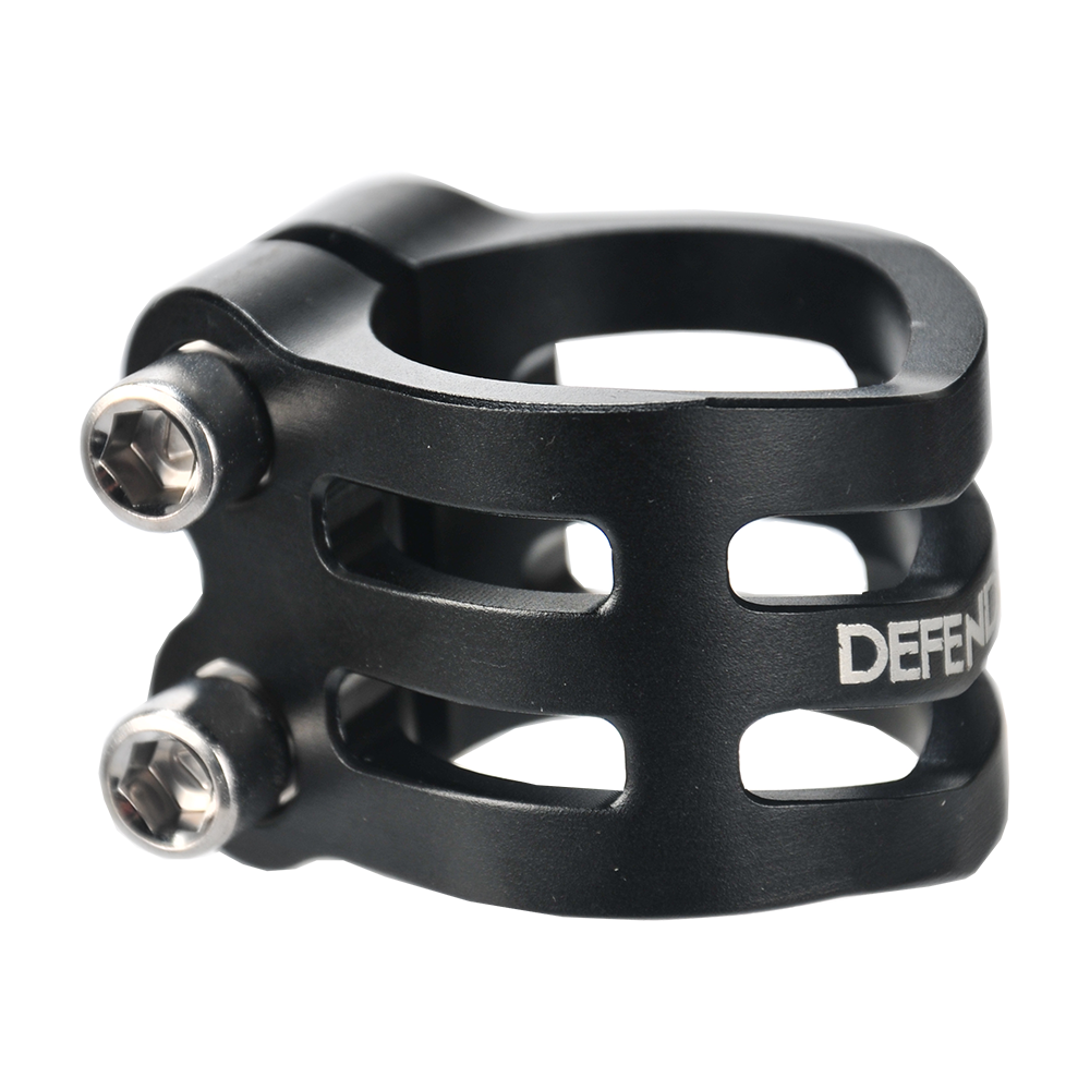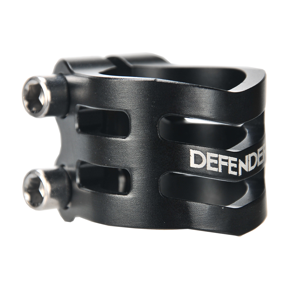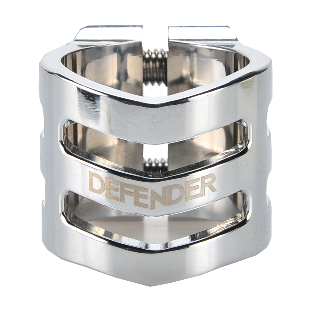 The DEFENDER clamp has a fresh, new design with chamfered edges. Its triple V-shape in the front is inspired by the RIG (Resource Integration Gear) from the DEAD SPACE trilogy. It weighs only 50 grams and has extra inserts to prevent the threads from stripping. It is designed for oversized bars but comes with a shim to make it suit to standard bars as well.