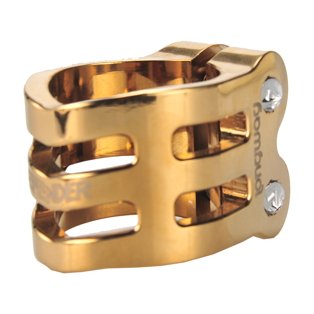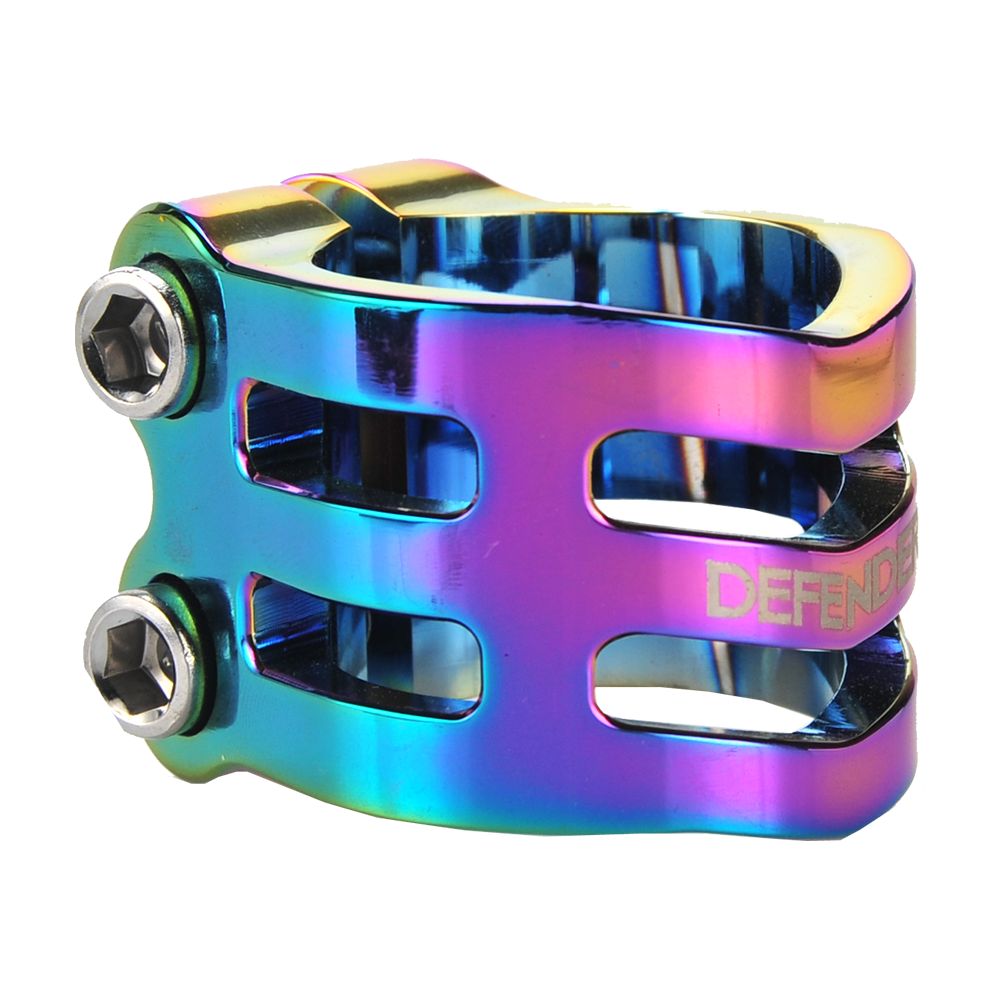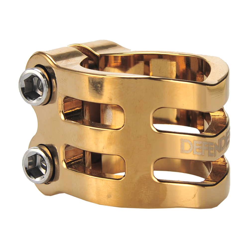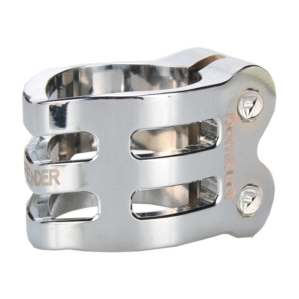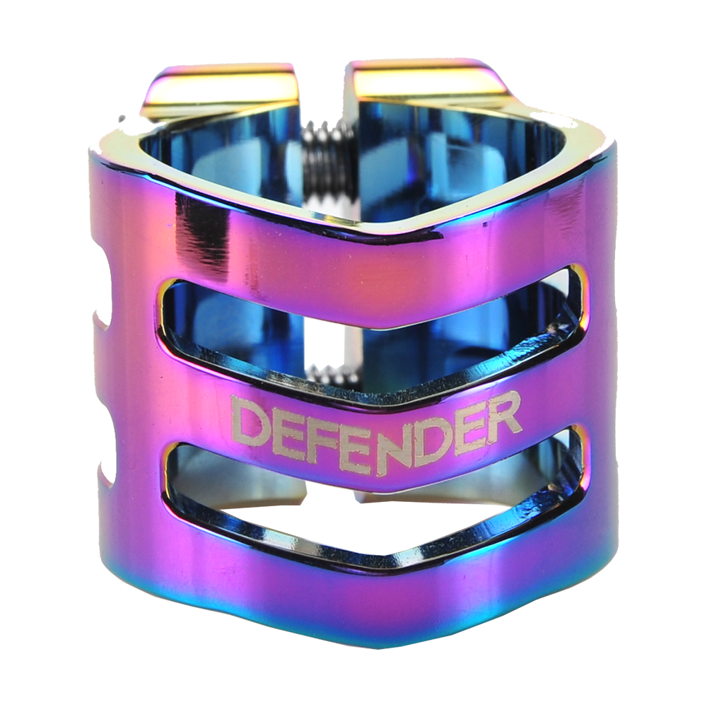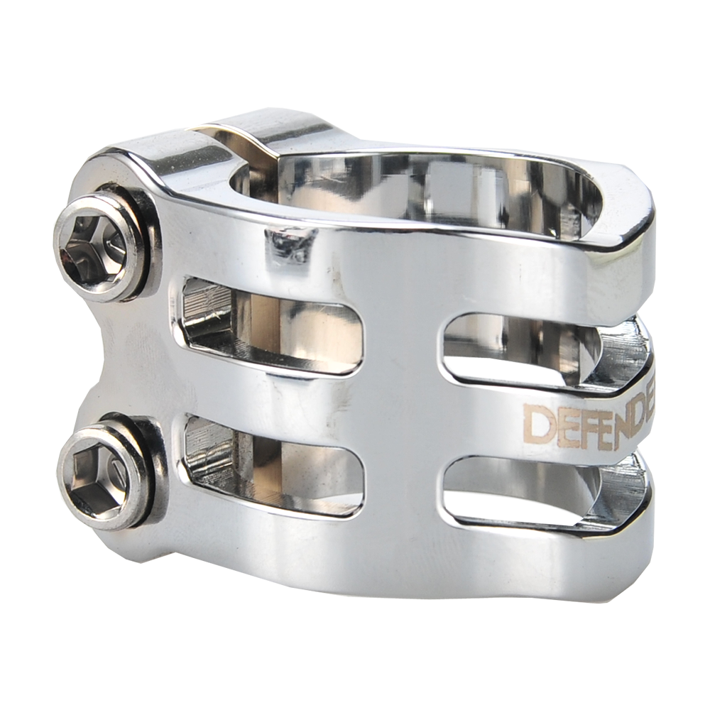 The DEFENDER clamp has a fresh, new design with chamfered edges. Its triple V-shape in the front is inspired by the RIG (Resource Integration Gear) from the DEAD SPACE trilogy. It weighs only 50 grams and has extra inserts to prevent the threads from stripping. It is designed for oversized bars but comes with a shim to make it suit to standard bars as well.