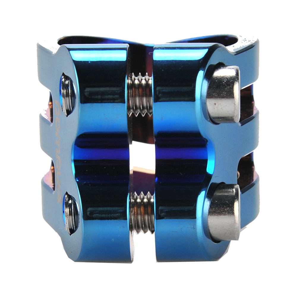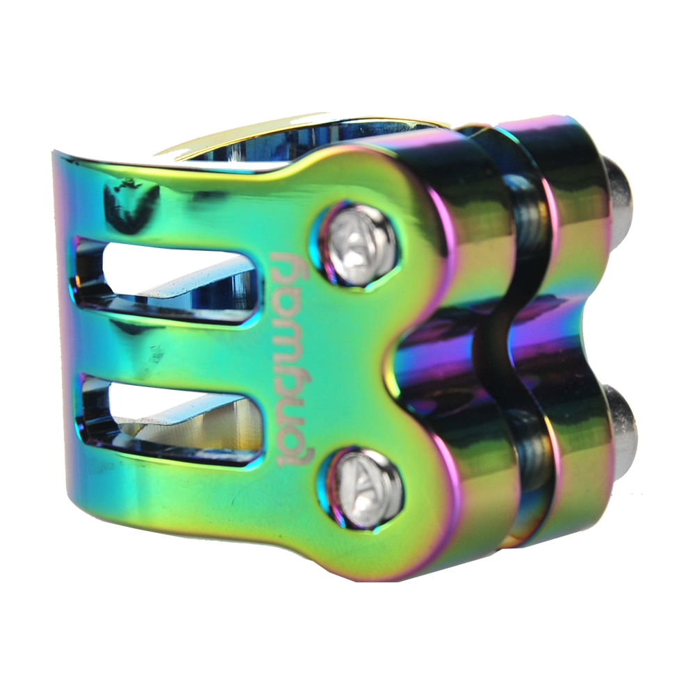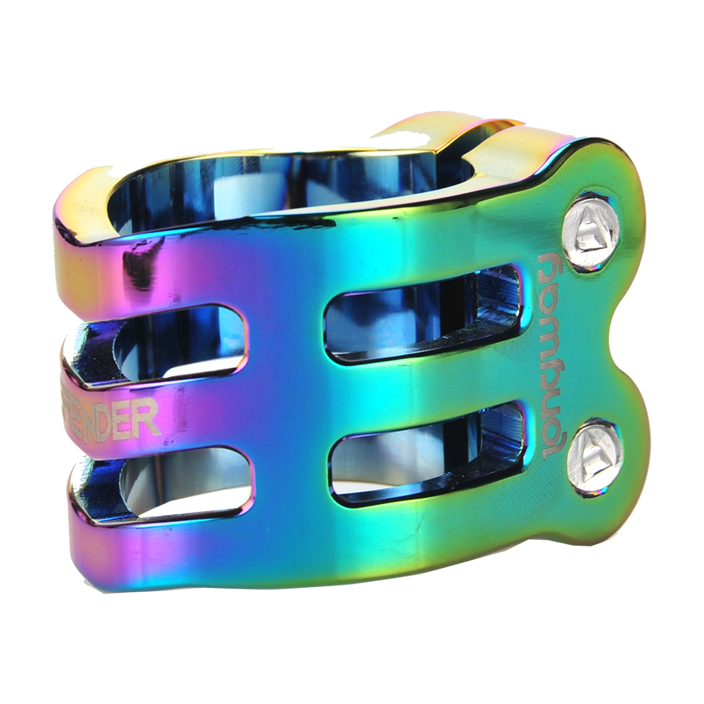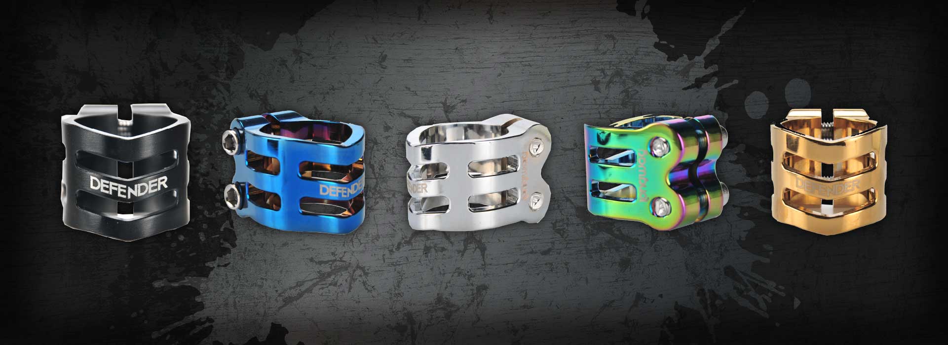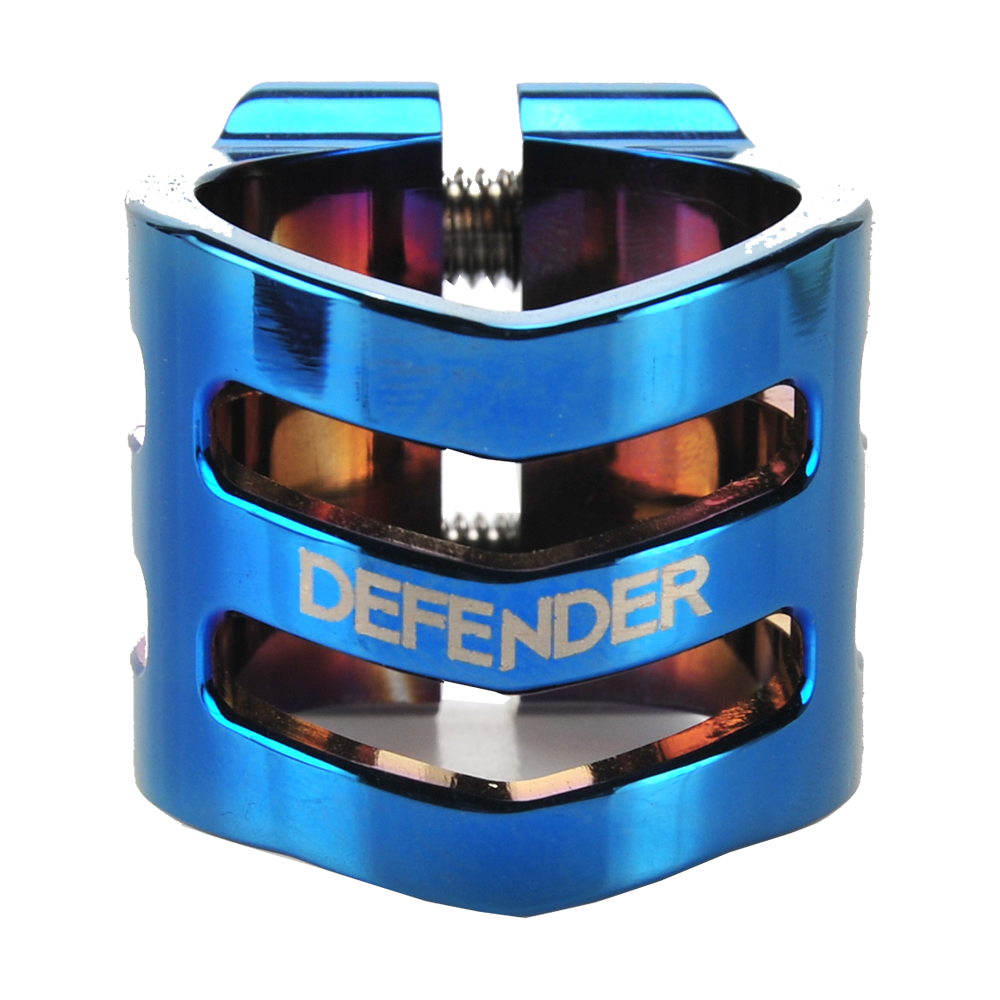 The DEFENDER clamp has a fresh, new design with chamfered edges. Its triple V-shape in the front is inspired by the RIG (Resource Integration Gear) from the DEAD SPACE trilogy. It weighs only 50 grams and has extra inserts to prevent the threads from stripping. It is designed for oversized bars but comes with a shim to make it suit to standard bars as well.