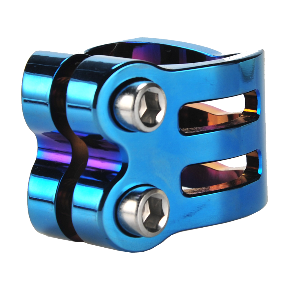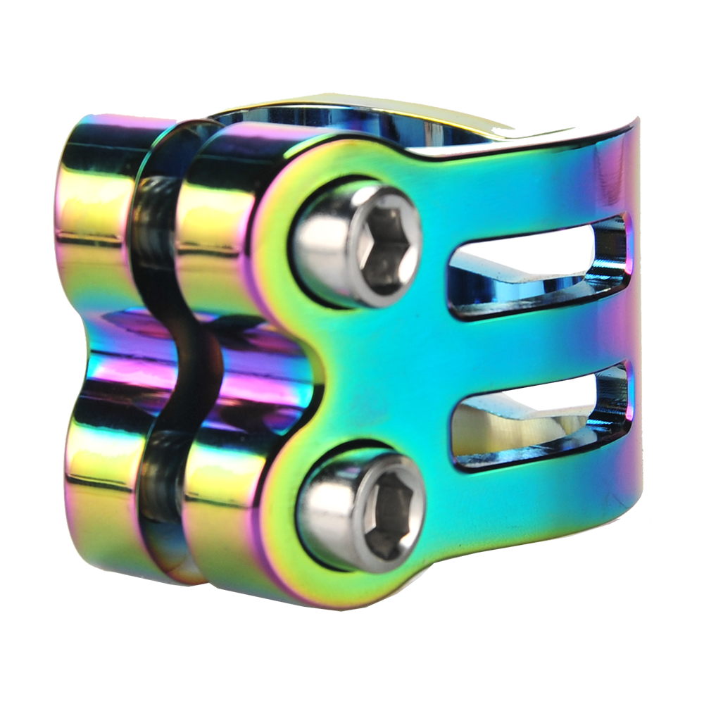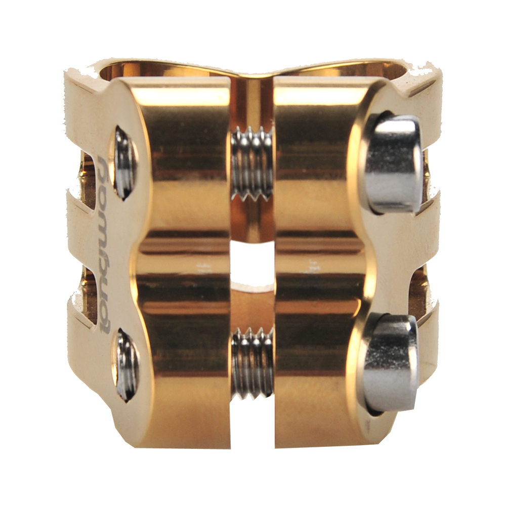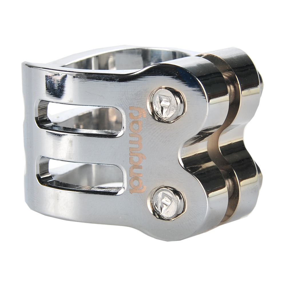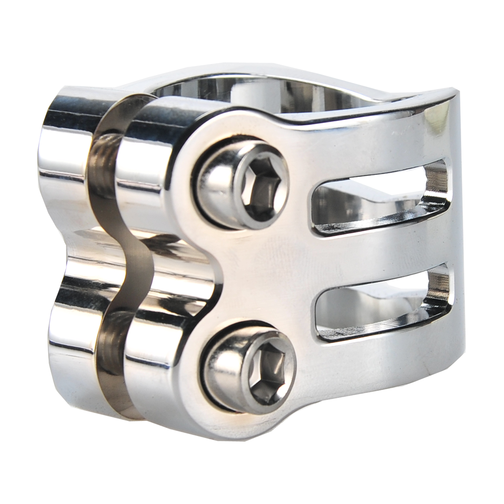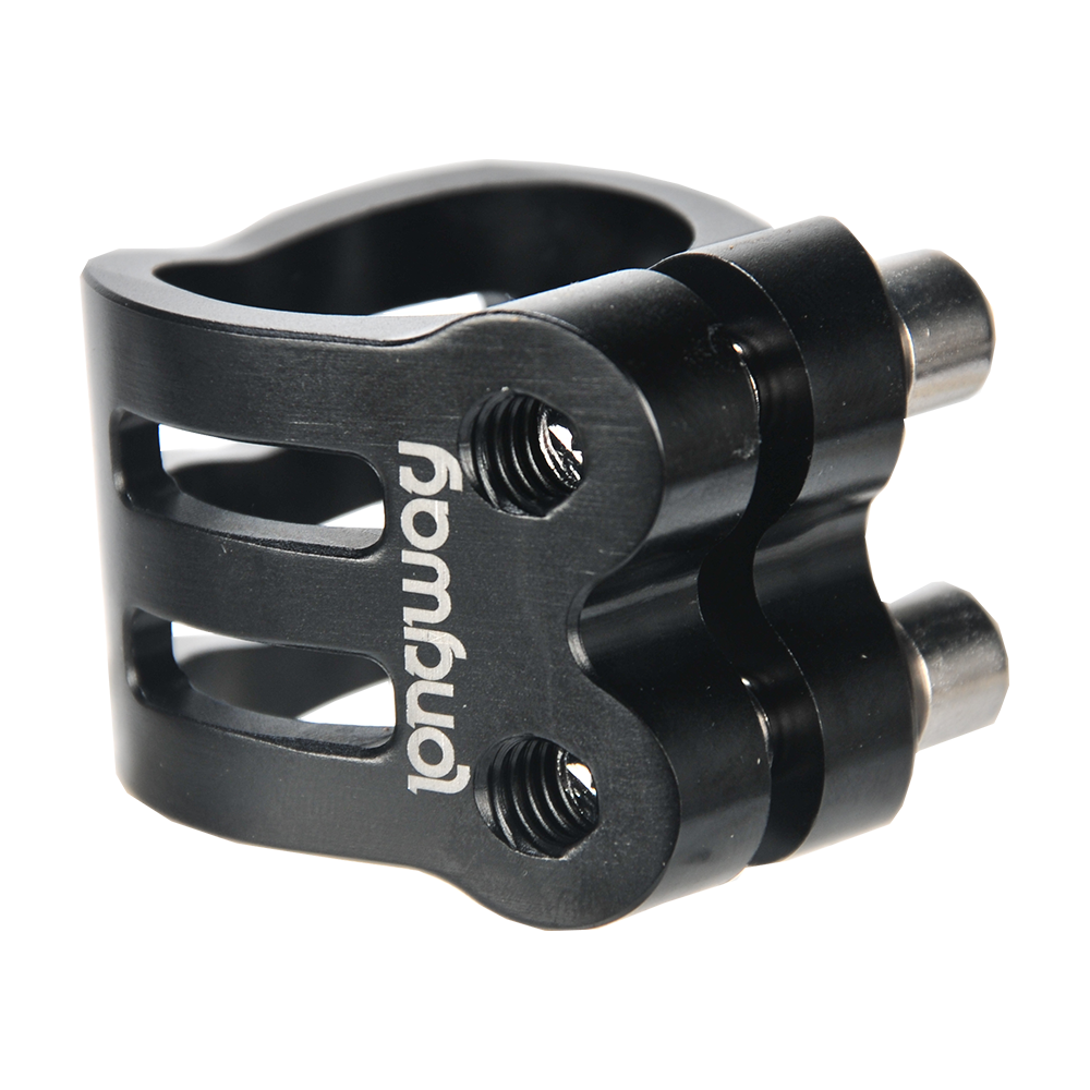 The DEFENDER clamp has a fresh, new design with chamfered edges. Its triple V-shape in the front is inspired by the RIG (Resource Integration Gear) from the DEAD SPACE trilogy. It weighs only 50 grams and has extra inserts to prevent the threads from stripping. It is designed for oversized bars but comes with a shim to make it suit to standard bars as well.
