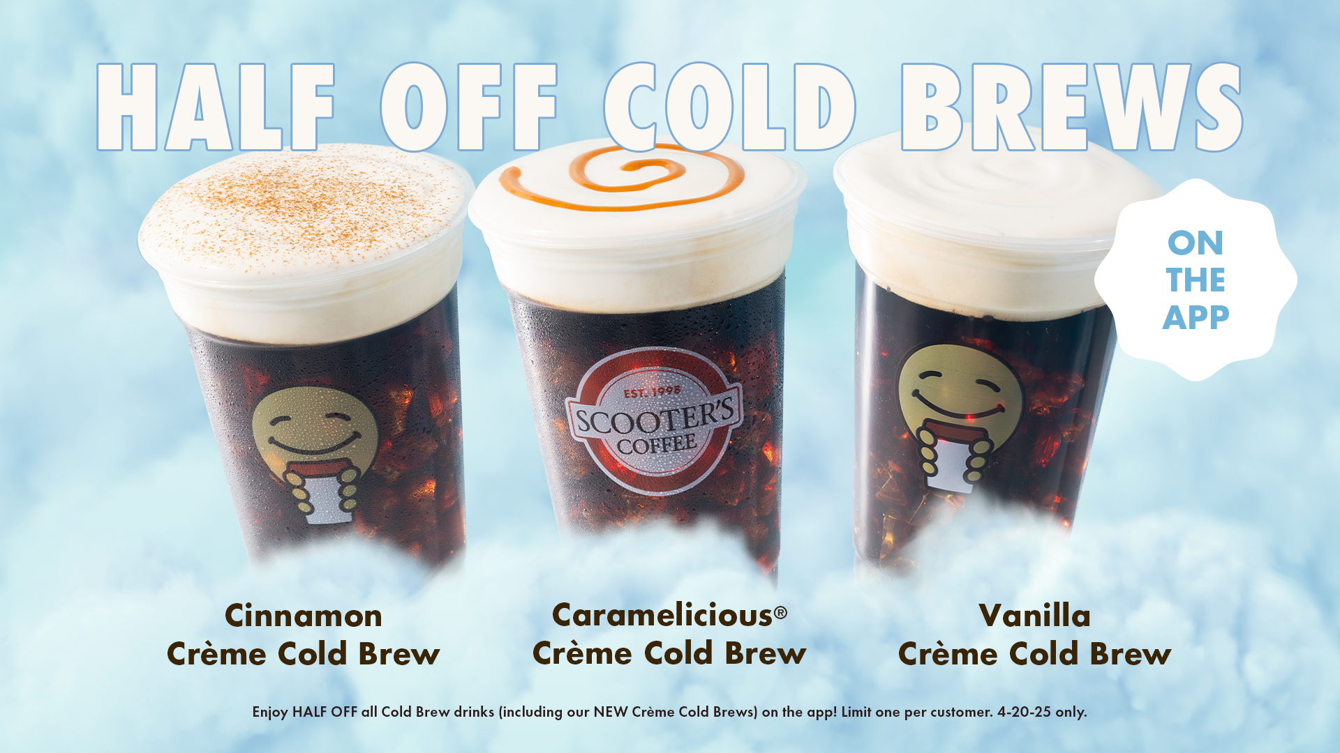 On Sunday, April 20, 2025, Scoot On Around® to your local Scooter’s Coffee location for half off any cold brew when redeemed through the Scooter’s Coffee mobile app. Our cold brew is slow-steeped for 24 hours in each Scooter’s Coffee location, so no matter which cold brew you choose, your taste buds are in for a smooth and bold coffee experience.