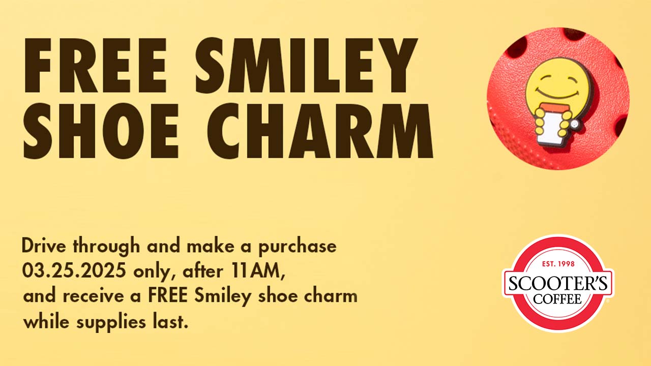 On Tuesday, March 25, 2025, beginning at 11 a.m., customers can Scoot On Around® to a Scooter’s Coffee location to score a free Smiley Shoe Charm! Give your kicks a Smiley flair with a special shoe charm featuring our beloved Smiley holding a cup of hot, fresh, and delicious Scooter’s Coffee (no doubt there’s a Caramelicious® in Smiley’s cup!).