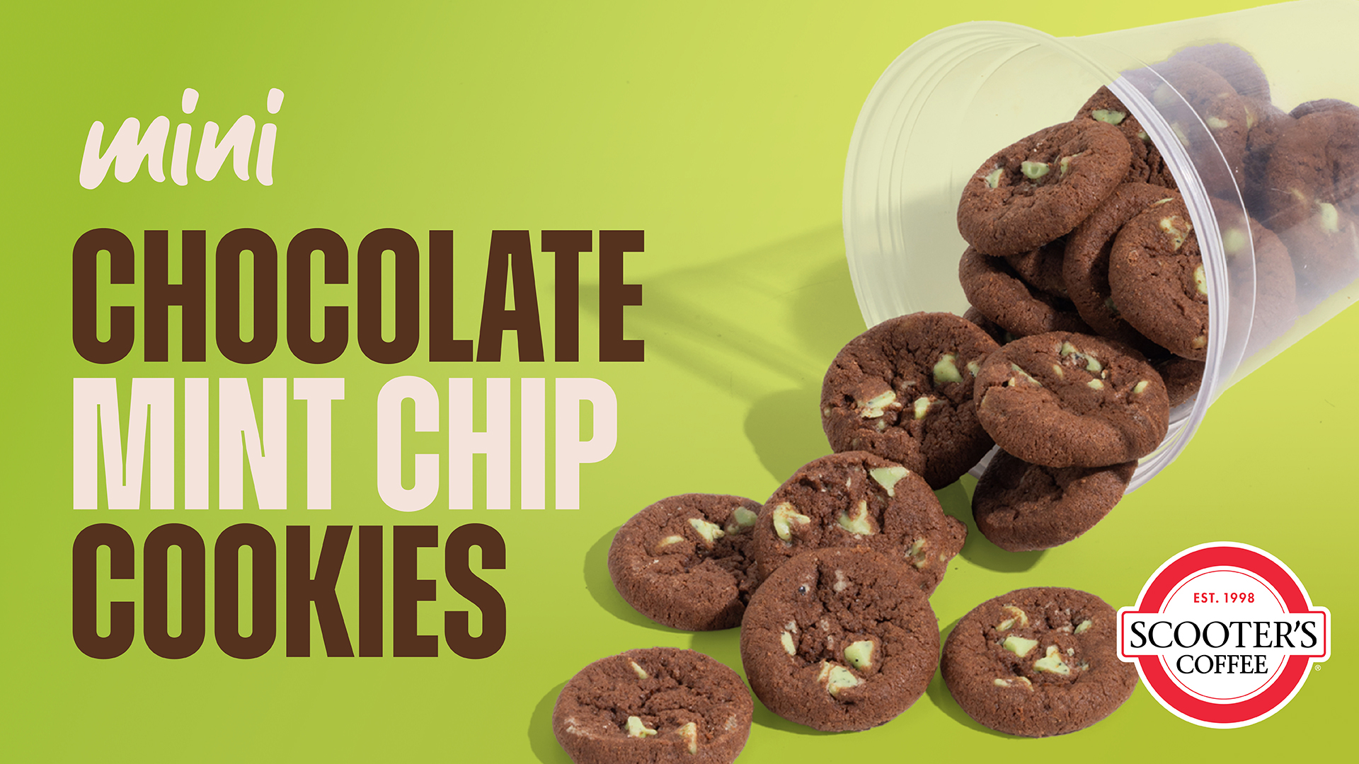 Freshen up your snack game with fresh new options at Scooter’s Coffee. Just in time for spring and ahead of St. Patrick’s Day, now’s the time to get your hands on our Mini Chocolate Mint Chip Cookies. These new craveable mini chocolate cookies, available for a limited time, feature bright green cool mint chips and chocolatey flavor in every soft and chewy bite-size cookie.