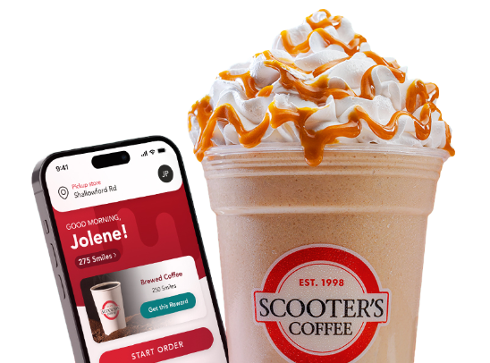 *Offer valid for a limited time only. Special terms apply. Free medium drink coupon valid for new app users only and awarded after first $5+ order (scan or mobile) using the Scooter's Coffee app. Valid on one regular-priced medium drink; excludes modifications and pre-packaged beverages. Limit one per customer across all accounts. Duplicate accounts or shared deviced may forfeit eligibility. Cannot be combined with other offers. Valid at participating locations. Coupon expires 14 days after issuance.