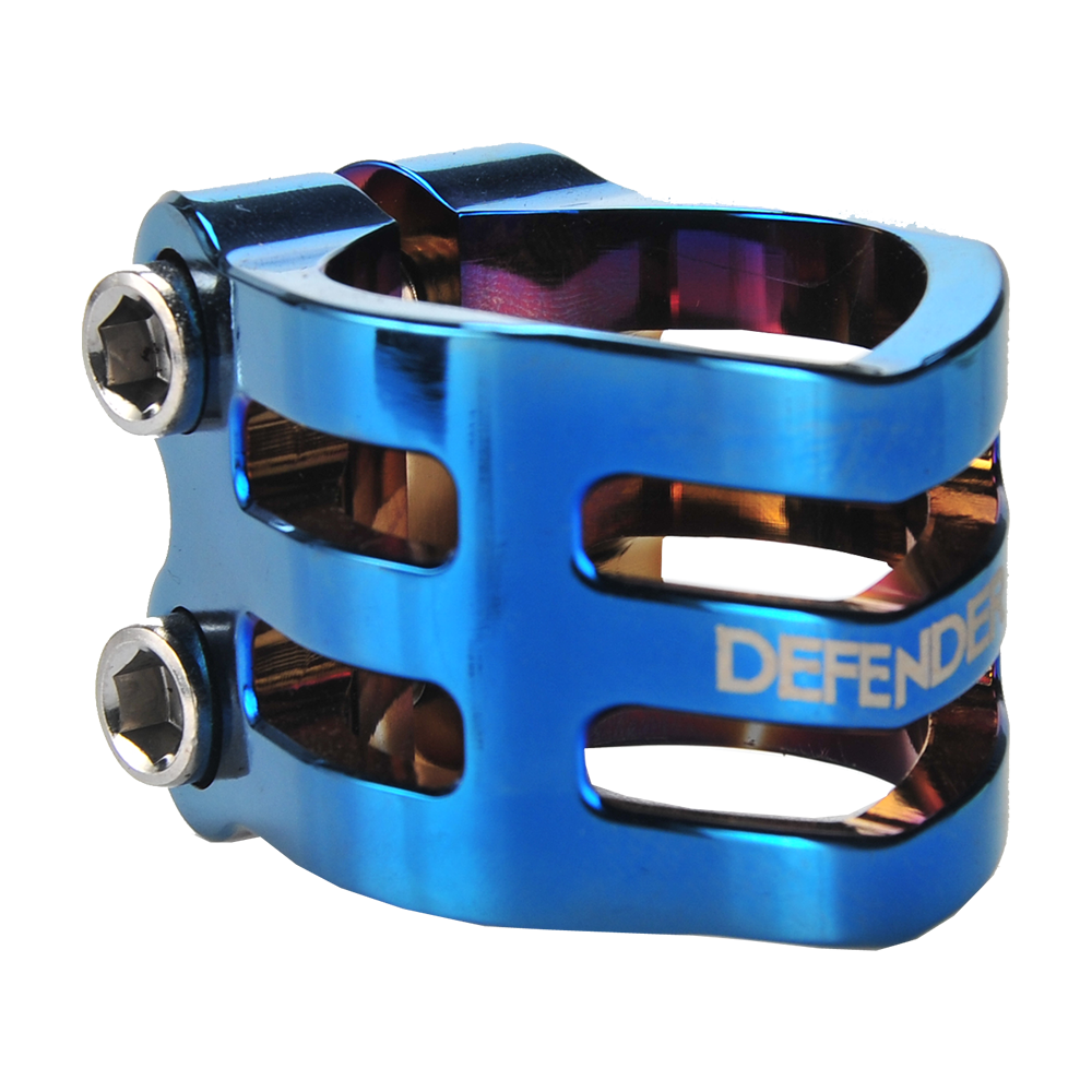 The DEFENDER clamp has a fresh, new design with chamfered edges. Its triple V-shape in the front is inspired by the RIG (Resource Integration Gear) from the DEAD SPACE trilogy. It weighs only 50 grams and has extra inserts to prevent the threads from stripping. It is designed for oversized bars but comes with a shim to make it suit to standard bars as well.